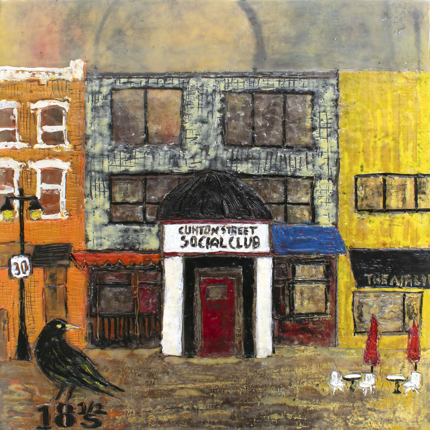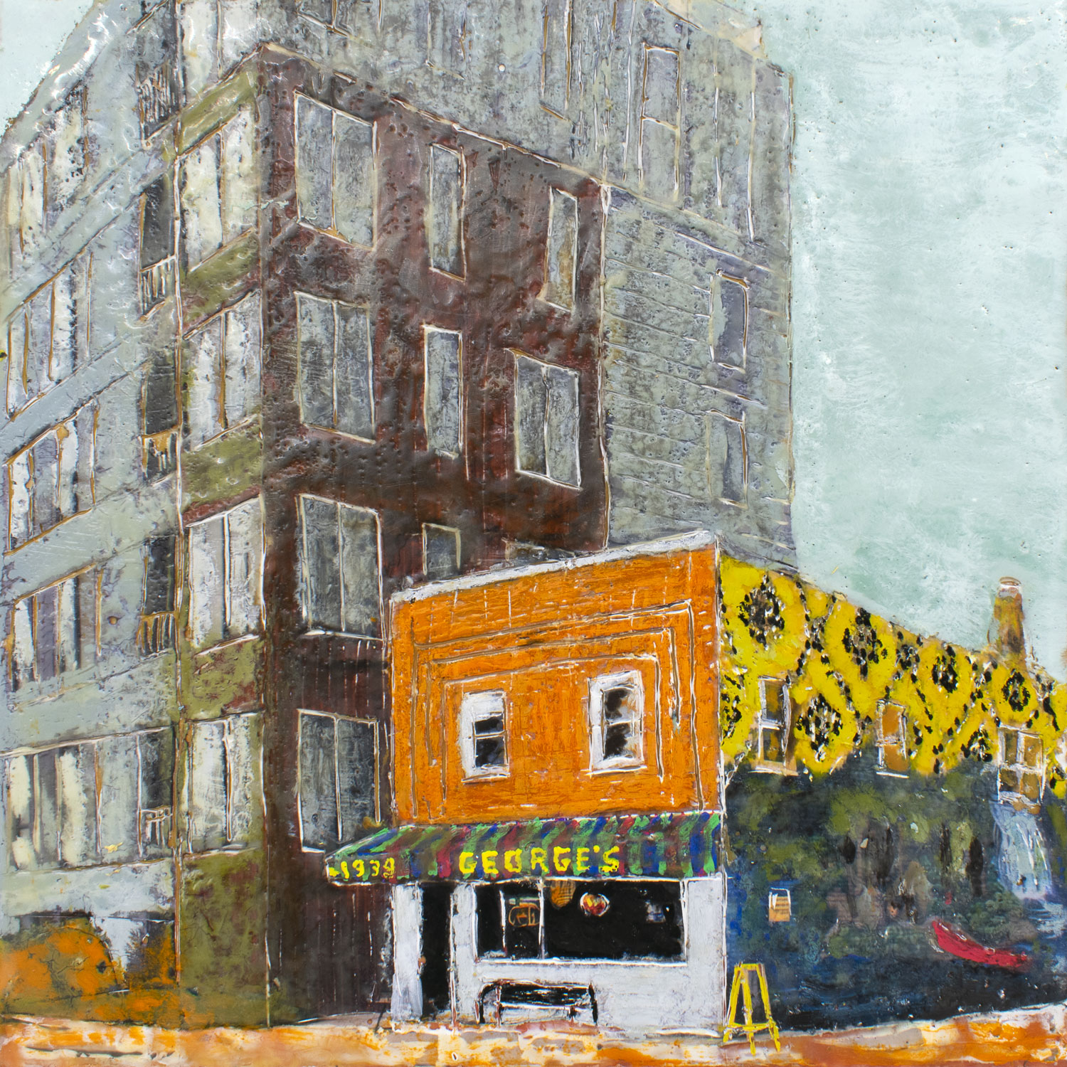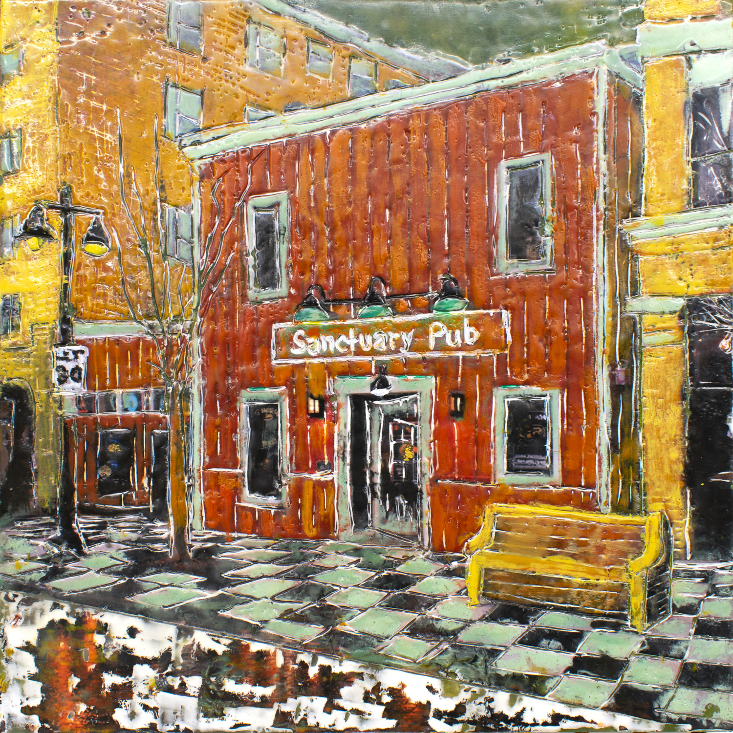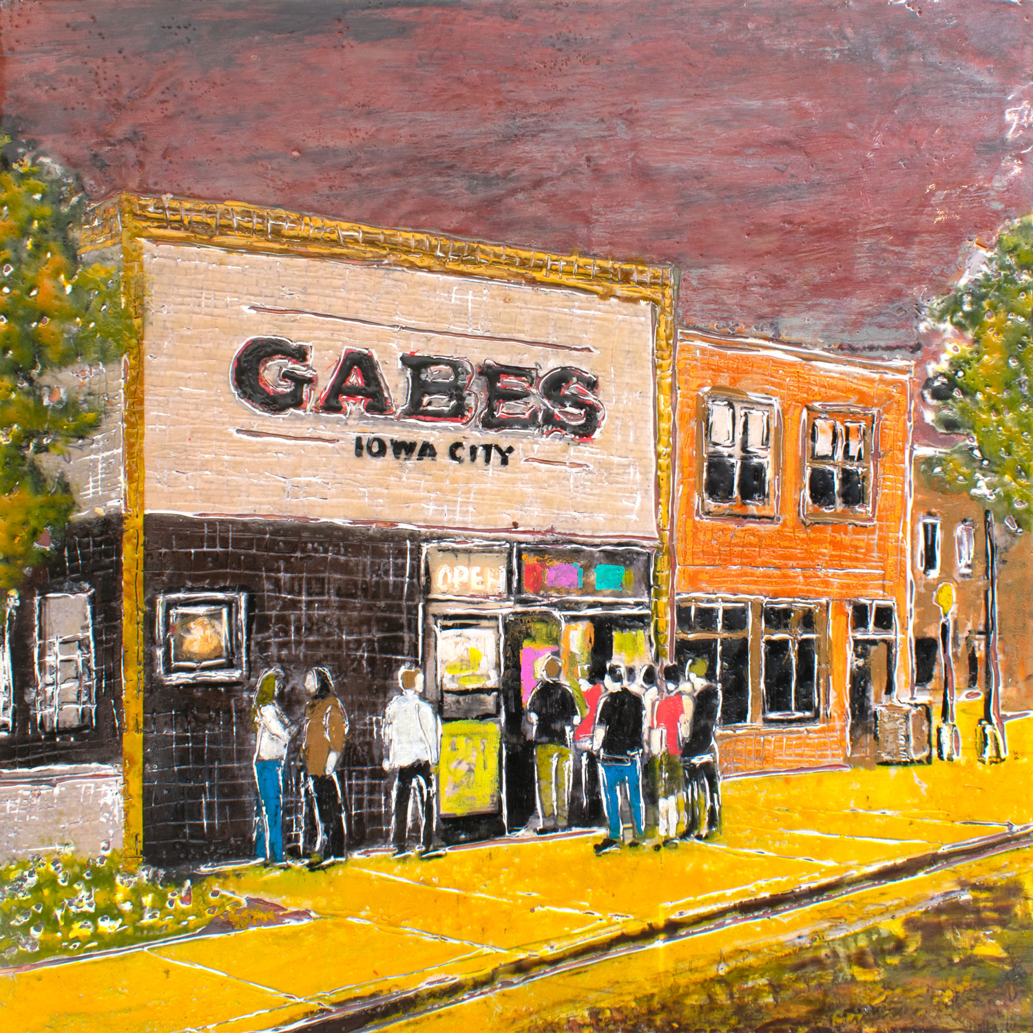 The series explores the dynamic interplay between memory and reality through encaustic painting. Each 12×12-inch portrait captures landmarks, businesses, and everyday scenes from cities and small towns. Many of the paintings represent places in Iowa City. The encaustic medium, with its rich texture and layering, enhances this transformation, creating a new version of the story that is less about precise representation and more about the essence and emotional resonance of the subject.