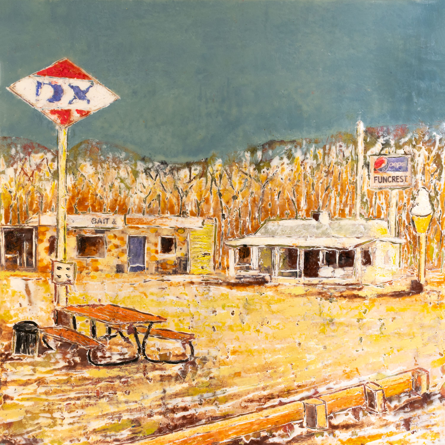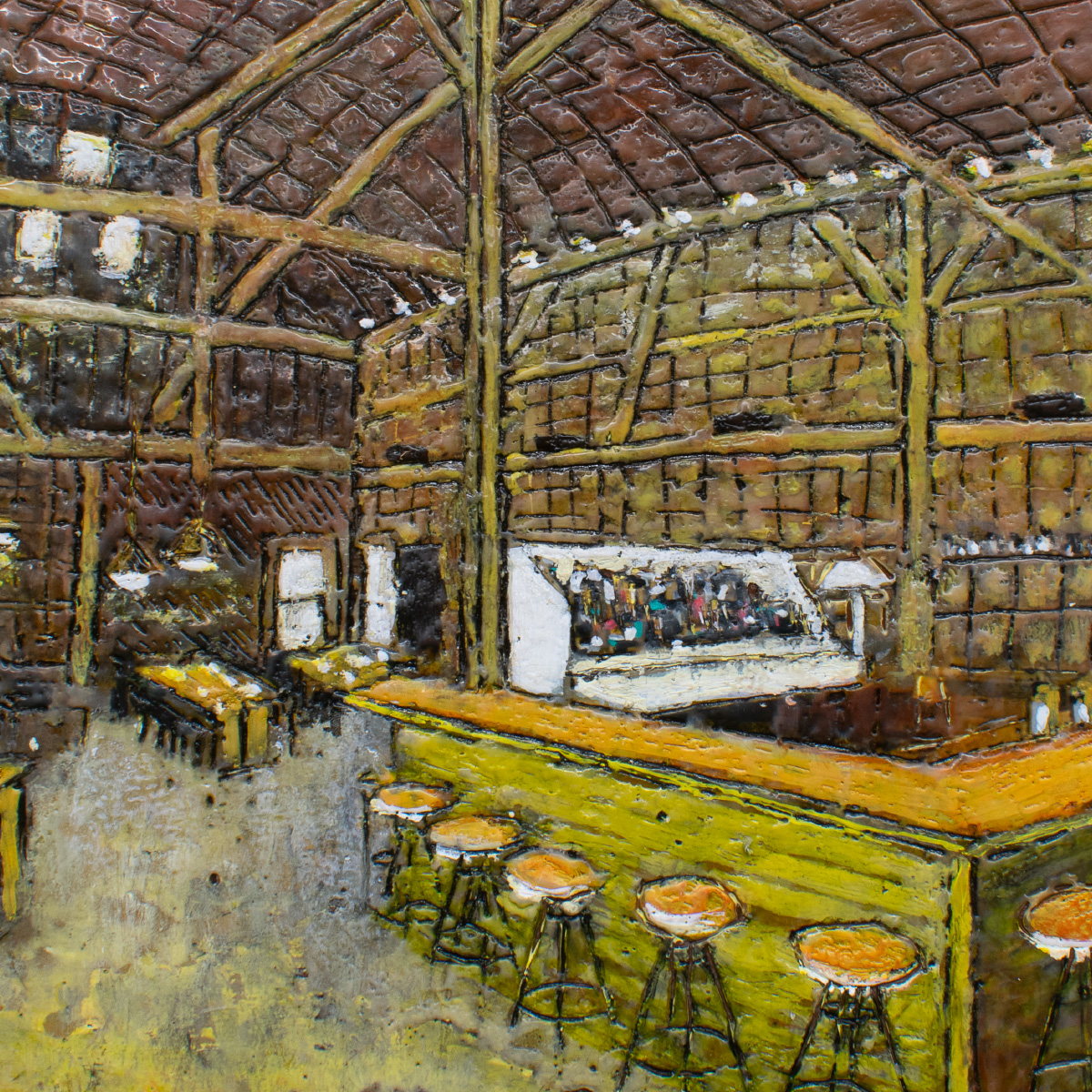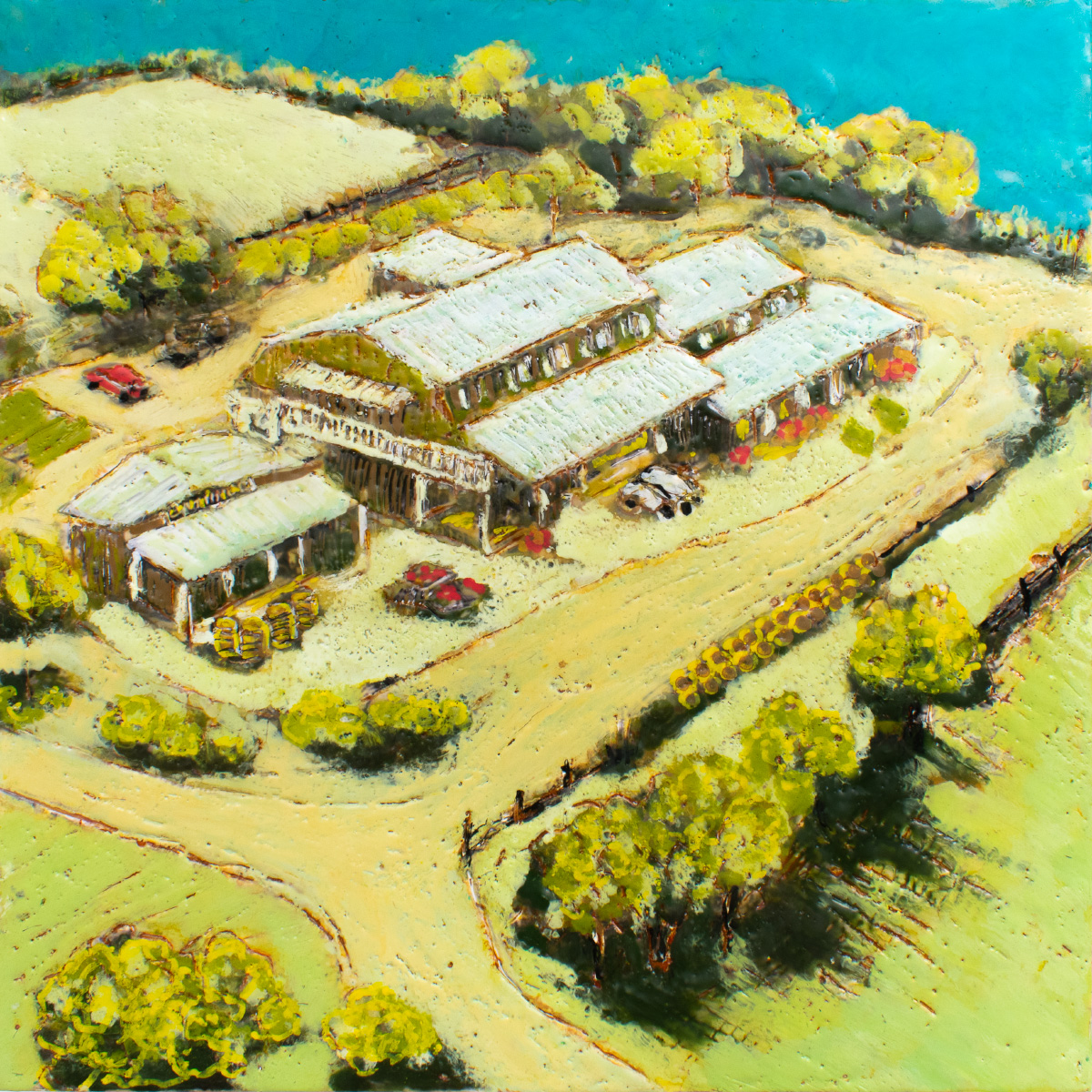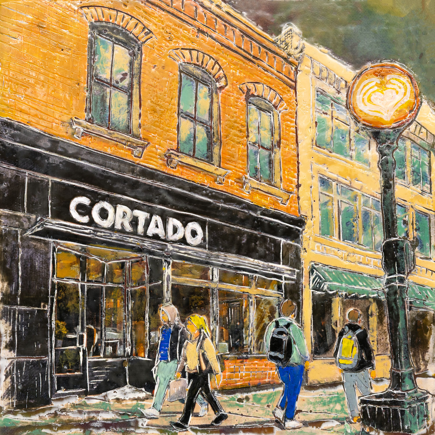 The series explores the dynamic interplay between memory and reality through encaustic painting. Each 12×12-inch portrait captures landmarks, businesses, and everyday scenes from cities and small towns. Many of the paintings represent places in Iowa City. The encaustic medium, with its rich texture and layering, enhances this transformation, creating a new version of the story that is less about precise representation and more about the essence and emotional resonance of the subject.