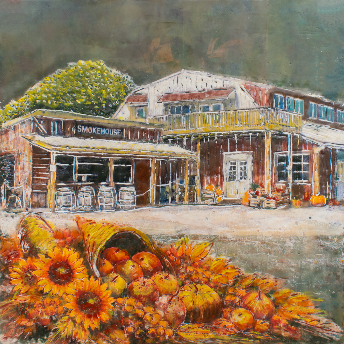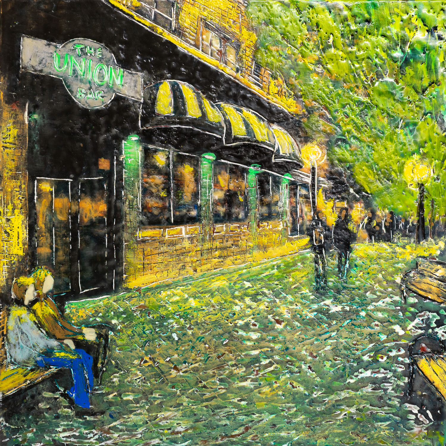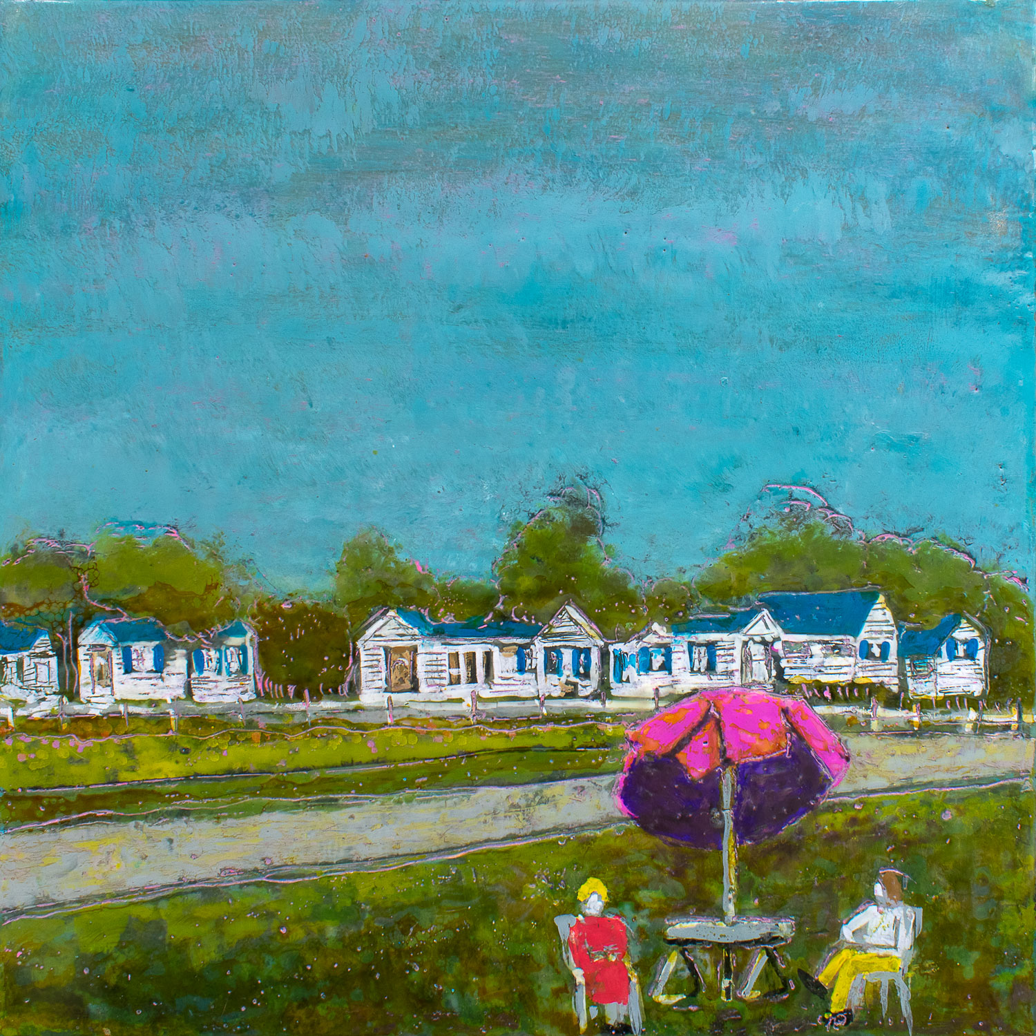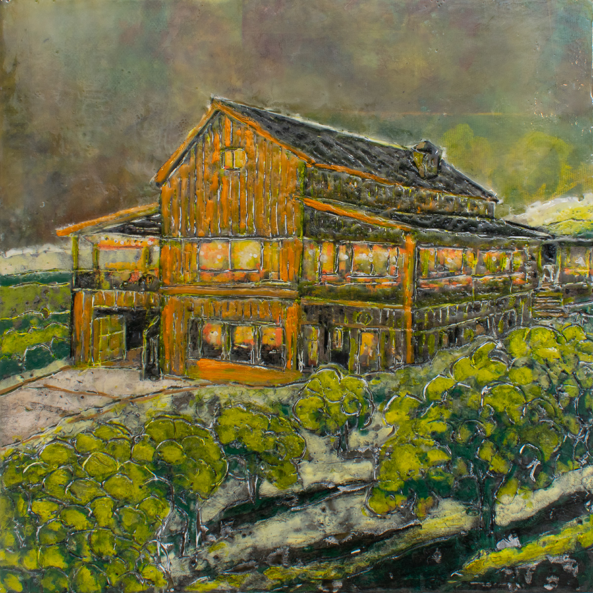 The series explores the dynamic interplay between memory and reality through encaustic painting. Each 12×12-inch portrait captures landmarks, businesses, and everyday scenes from cities and small towns. Many of the paintings represent places in Iowa City. The encaustic medium, with its rich texture and layering, enhances this transformation, creating a new version of the story that is less about precise representation and more about the essence and emotional resonance of the subject.